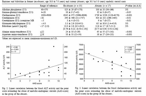All of the bodybuilders showed increases in aspartate aminotransferase (AST), alanine aminotransferase (ALT) and creatine kinase (CK) while gamma-glutamyltranspeptidase (GGT) levels were in the normal range. In comparison, hepatitis patients showed increased ALT, AST, and GGT levels while the control exercising medical students showed increased CK levels. From this, the researchers suggested that it is the correlation between AST, ALT and GGT that shows true liver dysfunction. Keep in mind, we can only guess that the 15 steroid users were using 17 alpha-alkylated steroids, and we do not know what the dosages that were used., but common sense tells us the results are likely relevant.