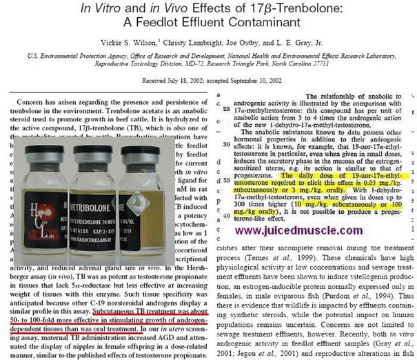 Trenbolone first gained fame under the brand names Finaject and Finajet, an oil based injectable veterinary steroid containing 30milligrams per ml of trenbolone acetate. Both of these product were marketed for use in food production animals, like cattle, pigs and sheep. Numerous studies have proven the effectiveness of trenbolone, when used with an estrogen, in improving quality weight gain in these animals while they ate less grain and feed, most studies noted a significant increase in muscle size, with a decrease in fat content, improving the “carcass quality’ (meaning better steaks) in the trenbolone-treated animals.